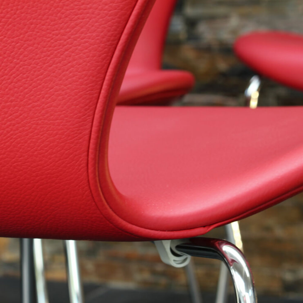 Ny stol produceret af Fritz Hansen. Ombetrukket af Møbelpolstren.dk. Classic rød læder.